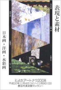 第36回豊田市民文化祭「とよたアートナウ2008」を豊田市美術館ギャラリーにて開催いたします。出展作家は牧内則雄(油彩画)、吉田千恵(日本画)、近藤朗(日本画)、近藤健二(日本画)、片桐幸行(油彩画)、竹下功(水彩画)。